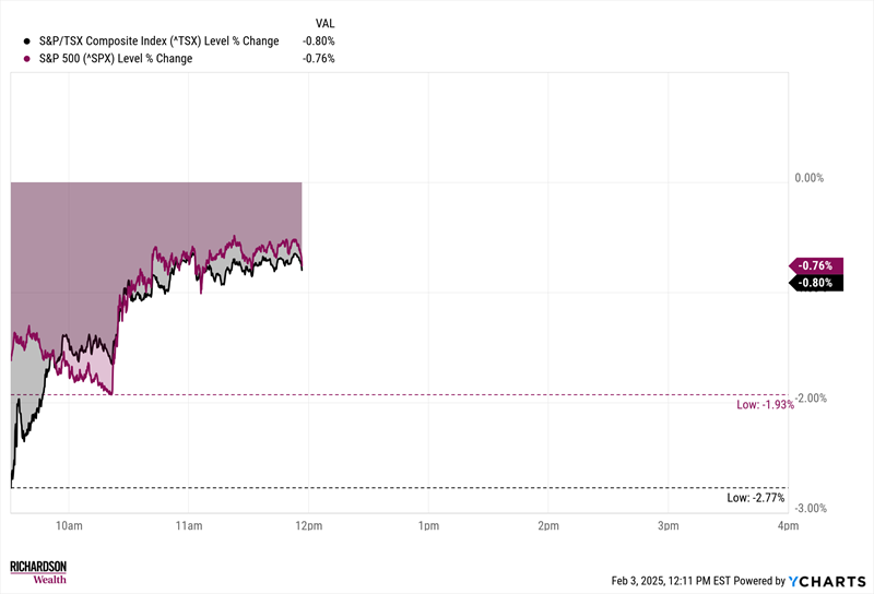 This morning, markets reacted sharply to the newly announced tariffs and Canada’s swift retaliation—an escalation that could mark a historic shift in Canada-U.S. relations. While trade friction was expected, the severity of these measures was higher than anticipated and resulted in an initial sell-off.